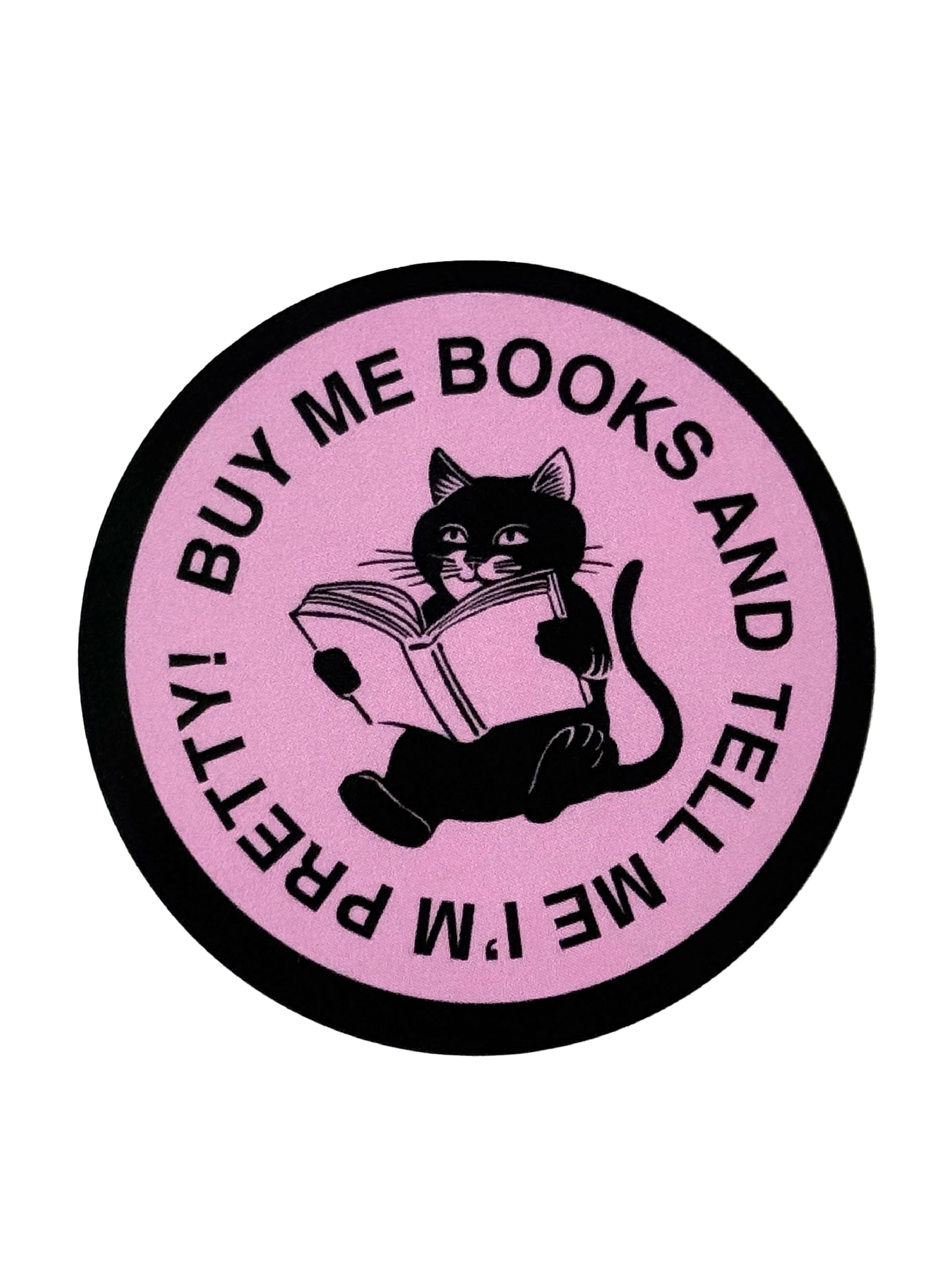 1 - 2.5" round "Buy me books and tell me I'm pretty" sticker.